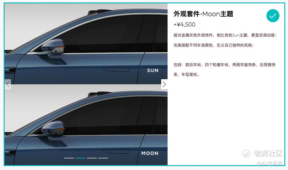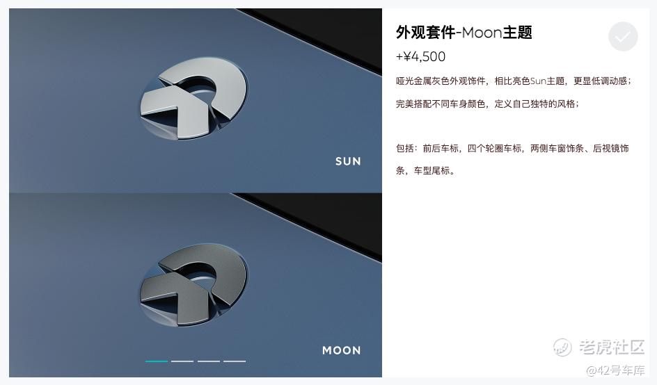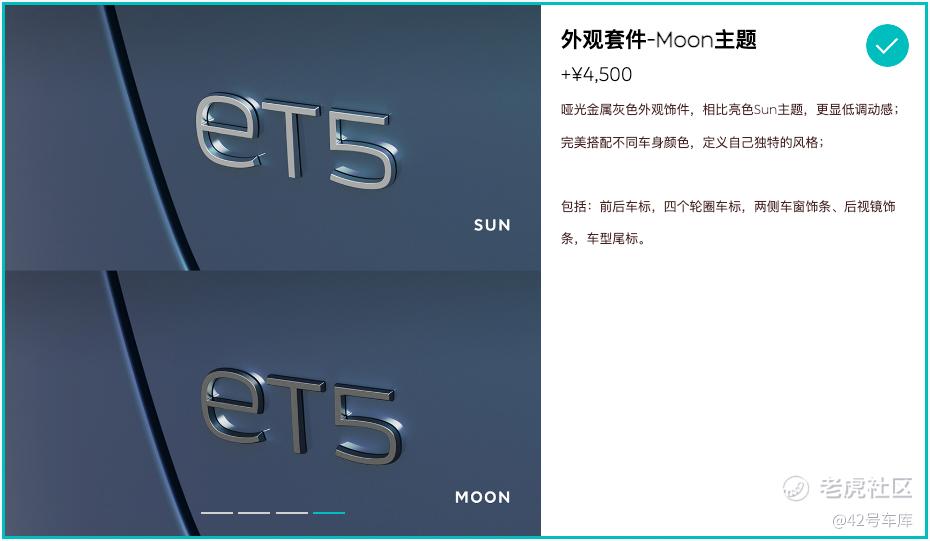 蔚来在外观上新增了这套名为「Moon」的哑光金属灰色套件,包含了前后车标、四个轮毂车标、两侧车窗饰条、后视镜饰条、车型尾标共 5 个部分,选装价格为 4,500 元。对于 ET5 这样的运动轿车,我觉得非常合适。