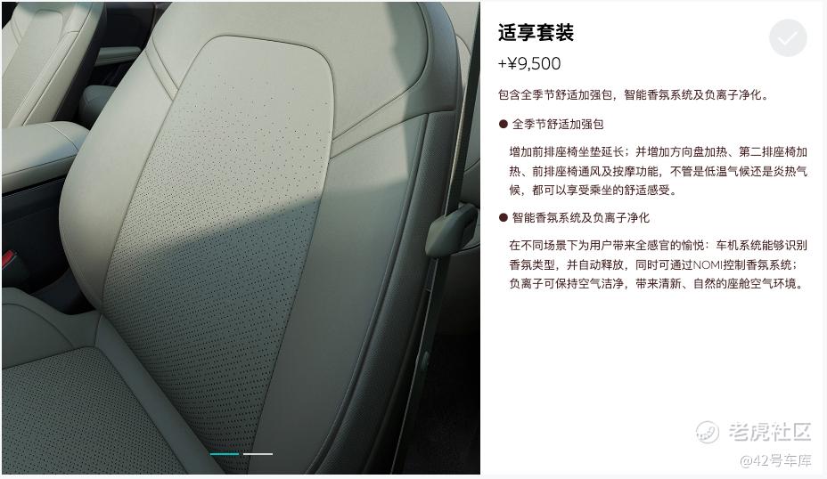 适享套装个人觉得是 ET5 最实用的选装了,包含前排座椅坐垫延长、前排座椅通风和按摩、方向盘加热、第二排座椅加热、智能香氛系统及负离子净化功能。9,500 元的价格或许不便宜,但大部分功能都很实用,非常推荐选装。