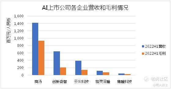 选取同行业已经上市发布半年报的AI公司对比,创新奇智营收增速最高,营收规模排名第二,毛利规模第二,仅弱于$商汤-W(00020)$ 。
