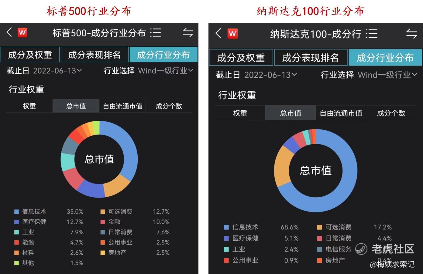 这两个指数占比最大的行业都是信息技术行业,前十大重仓股基本都是像苹果、微软、特斯拉、谷歌、脸书等这种高科技公司。