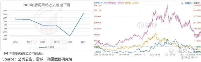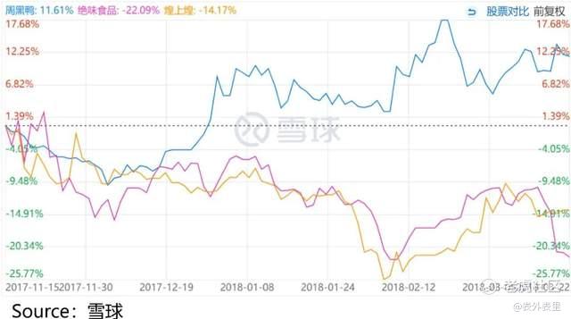幻象坍塌,市场马上翻脸。可以看到,2018年之后,走高端路线的周黑鸭,股价一直被大众化的绝味压制。