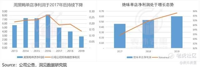 可以看到,2019年之前主要发力自营模式的周黑鸭,单店净利率是逐年下滑的;相比之下,主打加盟模式的绝味,却是向上的。