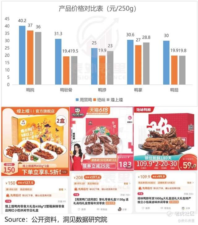 可以看到,相同品类的产品,周黑鸭的售价,通常约为同行的1.5倍。而高价礼盒装,甚至高于市场均价2倍不止。