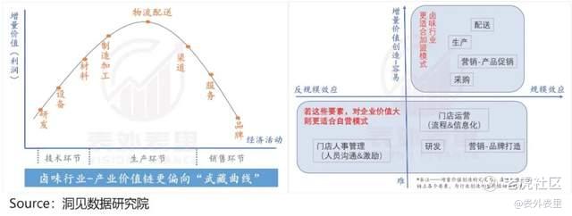 而卤味行业却截然不同,同质化竞争本质下,其研发以及终端的利润空间都有限,最大价值来源于中间——生产制造环节。由此,若同样选择自营,实际有些本末倒置。