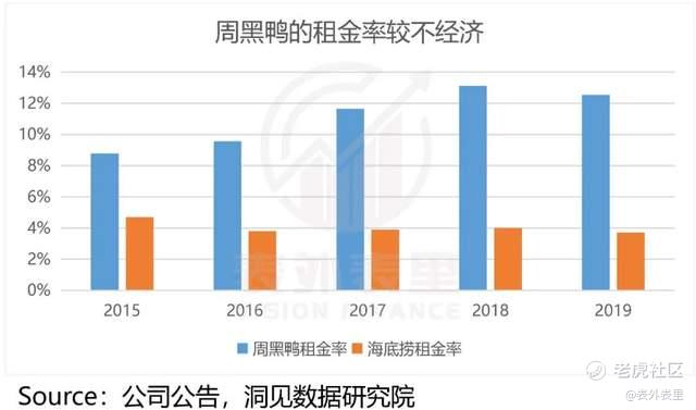 当然,如果有强大的品牌力加持,高昂的租金可以通过终端高消费收入来摊平。比如,以品牌力获得终端溢价的海底捞,其租金率在同期,常年维持在4%以下。而周黑鸭显然不属于这个行列。