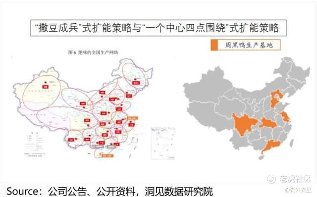 一种是周黑鸭的“一个中心四点围绕”,“长运输半径,中心枢纽型” 扩能;另一种,绝味的“撒豆成兵”,“短运输半径,全国分散型”扩张。