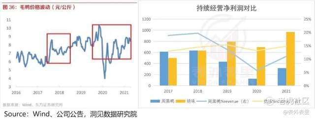 此外,原材料成本上,从持续经营净利润来看,2018年、2021年毛鸭价格普涨时,绝味受原材料波动的影响,相对更小一些。