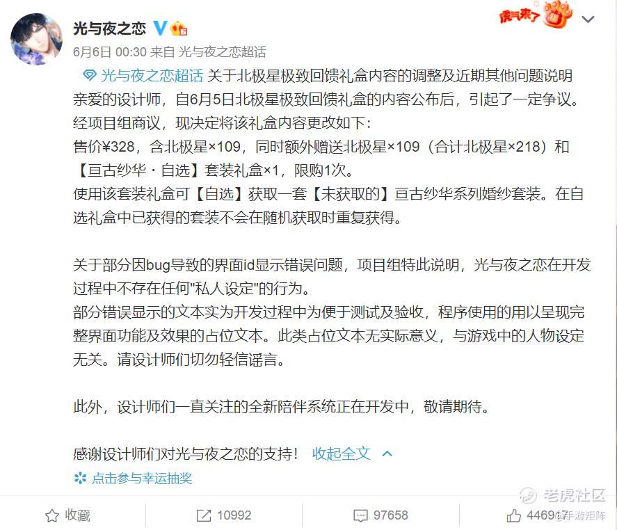 在“美兔事件”爆发后,《光与夜之恋》官博也做出了相应回应,对礼盒进行了一定的调整,也声称没有私设问题的存在。但玩家对其回应并不满意,随后“布朗云事件”的爆发,彻底将事态引入了难以收拾的地步。