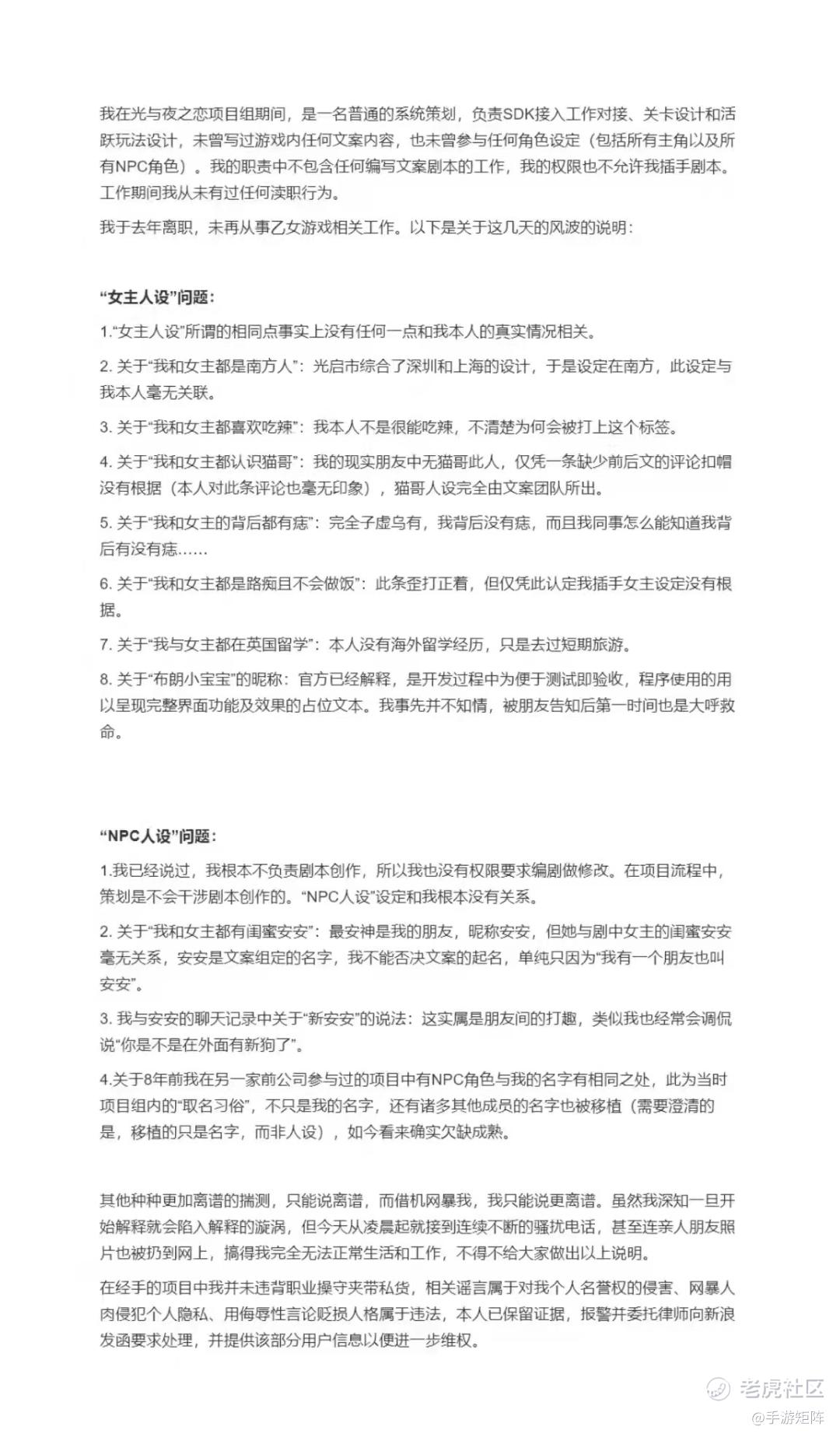 事实上,在游戏内策划组融入私人设定的行为并不少见,部分游戏还会以公司员工或老板为原型创造出NPC长留游戏内。但一是《光与夜之恋》作为一款女性向带有乙女性质的游戏,本身讲求的就是角色人设和故事,以及NPC的陪伴感,还有很大一部分玩家讲求角色代入感,强调原型的私设行为并不是明智之举。二是本次舆论之火烧到的,是女主这一极其重要的角色,同时还是不少玩家代入的本体,女主有原型,甚至是策划私设的的情况,一定程度上是相当恶劣的事件,特别是在当前国产乙女游戏市场现状中。