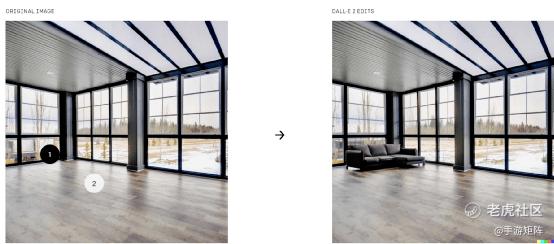 Dall-E 2的强大功能远不止此,除了凭空画图,AI还能在现有图片的基础上进行加工和微调,在图片的光影、结构等都不被改动的情况下,恰到好处地加入使用者想要的任何内容。例如,在一张“空旷的房间”图片里,Dall-E 2可以毫无违和感的加入一张沙发或者其他家具。