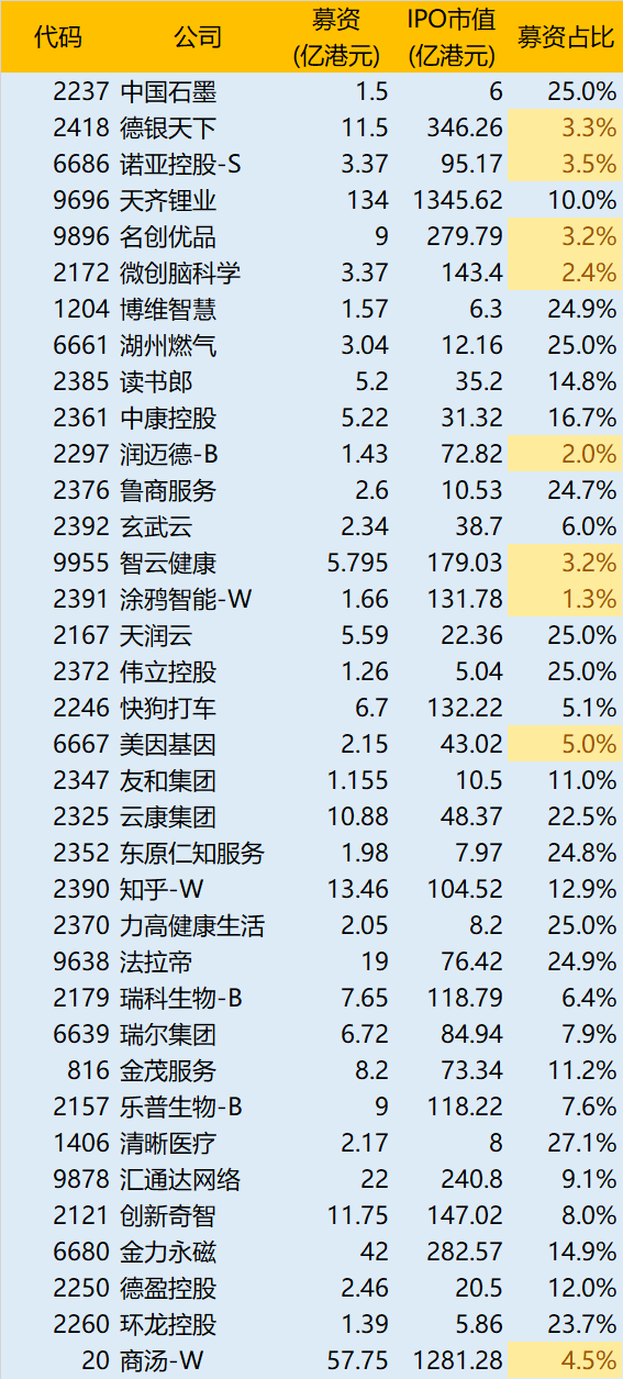 当然,未必所有公司都有基石投资者,或者都对基石投资者有禁售限制,而另一些募资量较小的公司可能是美股上市回港的。