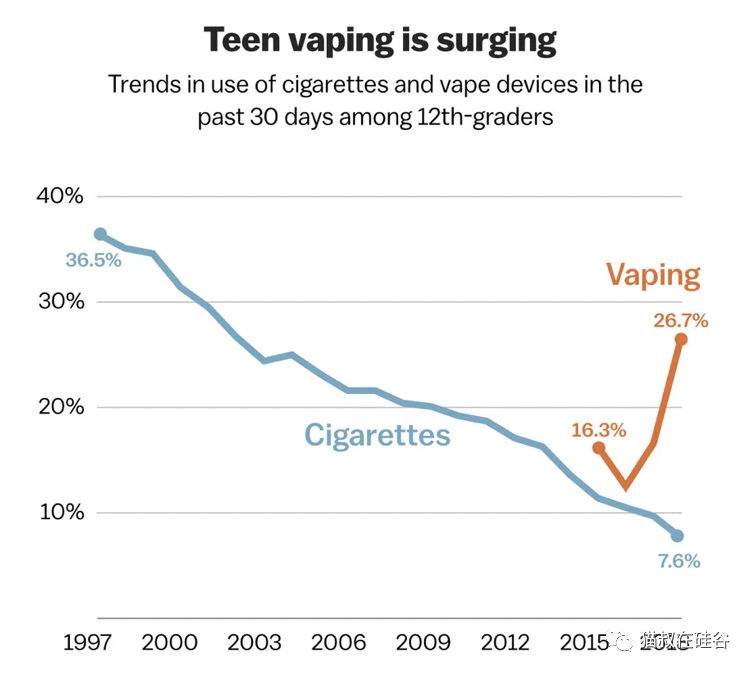 美国毒品滥用研究院(National Institute on Drug Abuse)在2019年1月所做的调查显示,美国30%的12年级高中生在2018年至少抽过一次电子烟。这是该机构进行类似调查的44年历史上的中学生吸烟最高比例。