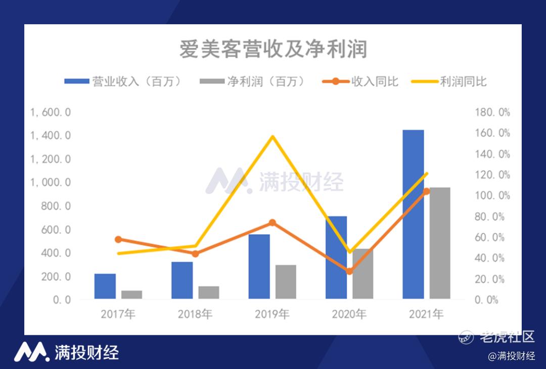 从近几年的业绩表现来看,爱美客的发展速度非常快。2017年至2021年,爱美客的营收从2.2亿元增长至14.5亿元,虽然2020年受疫情打击,增速下滑,但却在2021年迅速恢复并迎来爆发,实现104.1%的高增速,规模较2020年翻了一倍。得益于收入的快速恢复,爱美客的2021年的净利润同样大幅增长120.9%至9.6亿元,而2017年爱美客的净利润仅7670万。