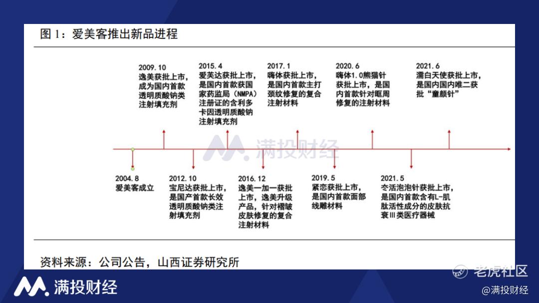 爱美客成立于2004年,2009年推出的逸美产品获批上市,成为国内首款商业化透明质酸钠(玻尿酸)类填充剂。此后,爱美客每隔一段时间就会推出新的医美产品,随着中国颜值经济的崛起,在爱美需求的推动下,拥有先发优势的爱美客逐渐成为国内透明质酸钠医美制剂领域的龙头企业。