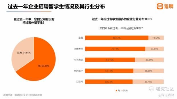 猎聘针对企业HR的调研显示,过去一年,有65.35%的企业HR招过留学生。这些HR分布最多的五大行业是金融、文教传媒、电子通信、制药医疗、互联网,其中分别有80.33%、76.19%、63.16%、61.11%、60.23%的HR招过留学生,留学生在这些行业最受欢迎。
