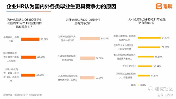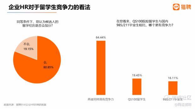 猎聘针对企业HR的调研显示,80.85%的企业HR认为在同等条件下,留学经历会成为候选人的加分项。当问及QS100的留学生和985/211的毕业生哪个更有竞争力,64.44%的HR认为两者同样具有竞争力,其背后得票率最高(83.02%)的理由是“各有所长,各有千秋”;19.45%的HR认为QS100的留学生更有竞争力,其背后得票率最高(84.38%)的理由是“QS100院校名气大,国内外都认可”;另有16.11%的HR认为985/211毕业生更有竞争力,其背后得票率最高(81.13%)的理由是“熟悉本土情况,更易适应国内工作”。