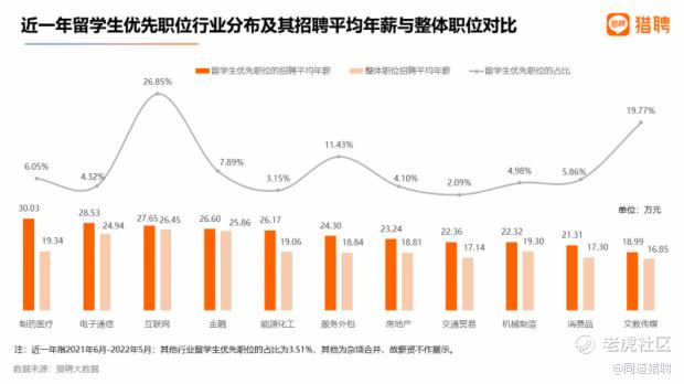 猎聘大数据显示,近一年留学生优先职位占到全体职位的10.15%。留学生优先职位招聘平均年薪为24.43万元,比全体职位招聘平均年薪(21.14万)高出3.29万元。留学生优先职位薪资高出整体水平体现了用人单位对留学生价值的肯定。