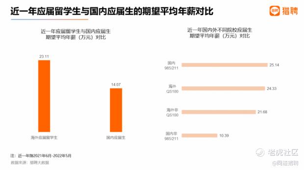 6月28日,猎聘大数据研究院推出《2022海外应届留学生就业竞争力洞察报告》,报告显示, 应届留学生期望平均年薪为23.11万,比国内应届生高出9.04万元。