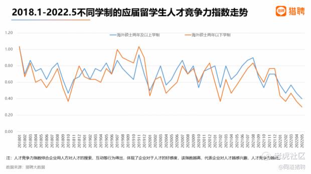 在国内,人们将一些学制短的硕士学历称为“水硕”,对其竞争力提出质疑,有些学制短的留学生也担心自己的就业,猎聘大数据结果证明,这些担忧大可不必。猎聘大数据显示,2018年1月至2022年5月,海外硕士两年及以上学制、海外硕士两年以下的应届留学生人才竞争力指数整体来看不相上下,可见学制长短对于留学应届生求职影响不大。