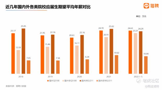 2018年到2021年,从国内外各类应届生的期望平均年薪来看,国内985/211>海外QS100>海外非QS100>国内非985/211。从2022年1-5月来看,海外QS100>国内985/211>海外非QS100>国内非985/211,依次分别为24.63万、24.29 万、23.21 万、10.04 万。