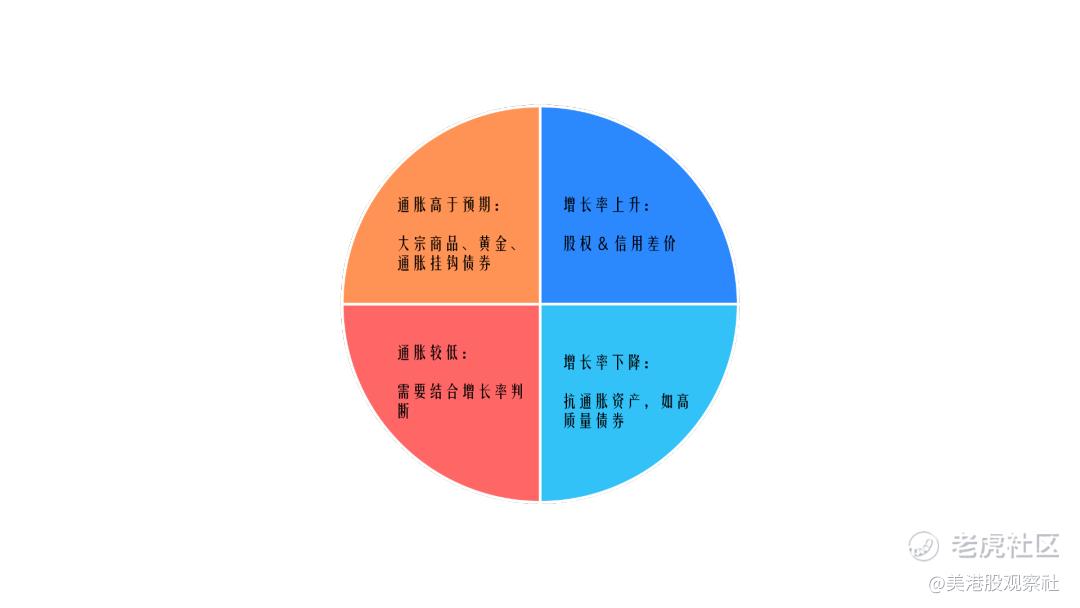 在增长率下降的时候,以防守为主,需要投资一些抗通胀的资产,如高质量债券。在通胀高于预期的时候,购买大宗商品、黄金或者通胀挂钩债券是一个好的选择。在通胀低的时候则没有比较固定的大类资产,需要结合增长率进行判断。