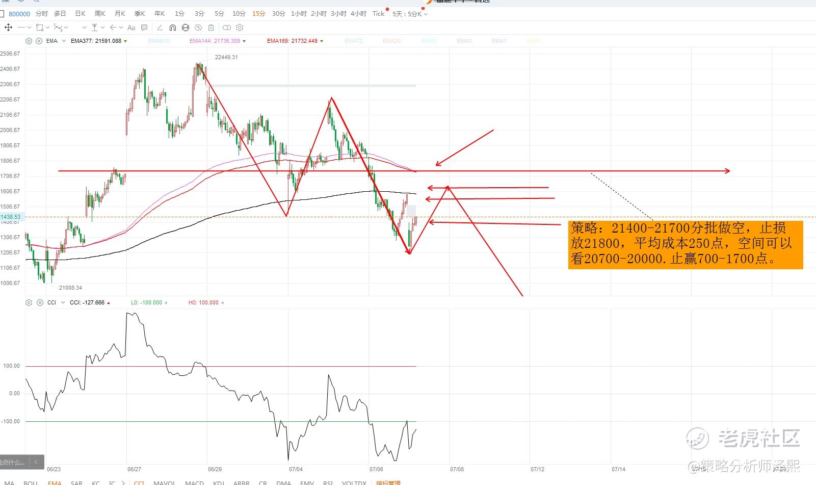 做空的理由有三点:第一点就是日线级别的压力,22500两次探顶都表示有明显的压力,下跌至21458之后,反弹至22198,但日线收盘收在了21853,说明反弹没有超过黄金分割的50%。