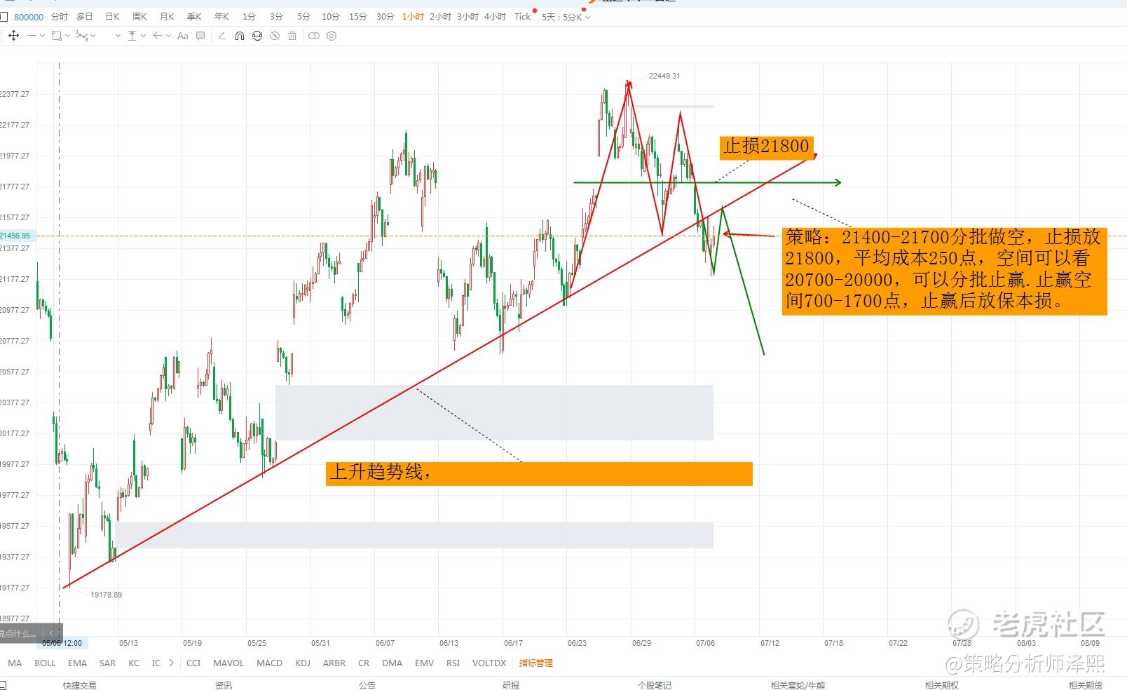 第二点:从19178至22449,从上升趋势线来讲,不能跌破21500,那么现在最低跌到21200,所以说从这个角度来讲,现在的行情是还要回调的。