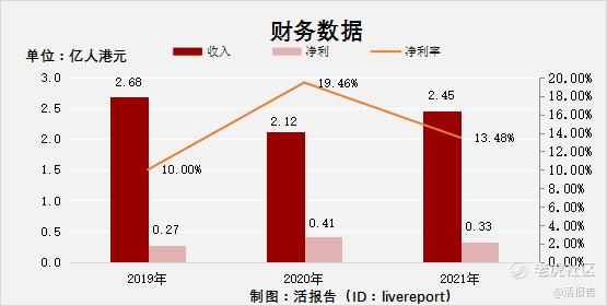 收入分别约为港元2.68亿元、2.12亿元、2.45亿元,年复合增长率为-4.32%;