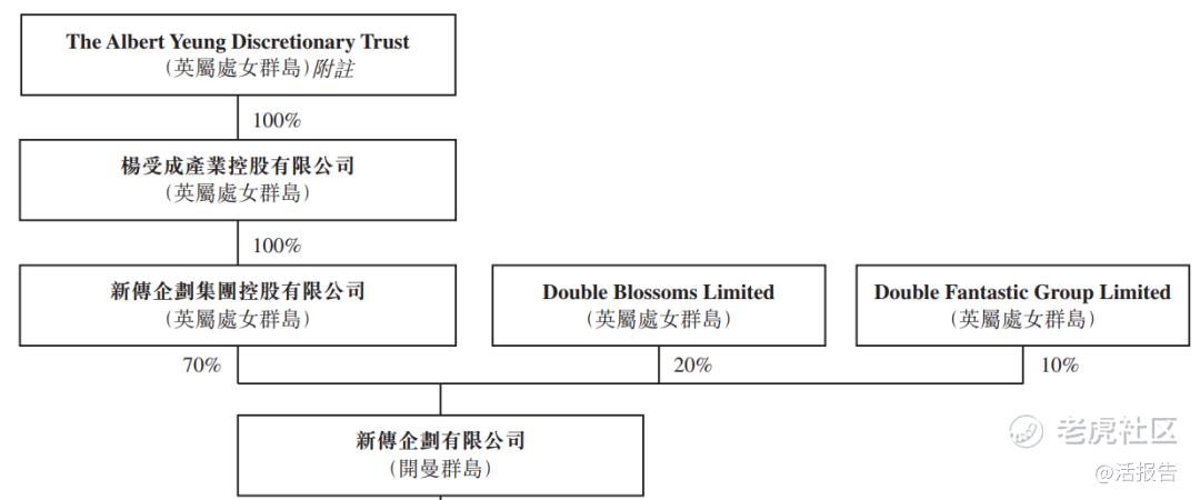 公司的直接控股公司及最终控股公司分别为新传企划集团控股有限公司及杨受成产业控股有限公司(「杨受成产业控股」),而杨受成产业控股由First Trust Services AG 作为The Albert Yeung Discretionary Trust(由杨受成博士(「杨博士」)创立的私人全权信托)的受托人依法全资拥有。