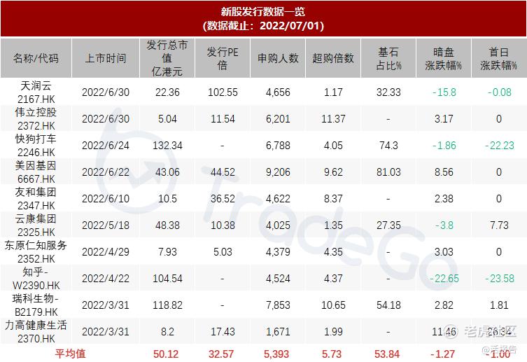 暗盘及首日收益率上,今年1月以来好坏参半;2月份,新上市的汇通达表现尚可,清晰医疗则一般,乐普生物-B则微涨;3月份初金茂服务首日大跌28.75%,物管类公司依然不受市场看好;瑞尔集团上市首日表现略差,但在3月份即将结束之时,新上三家新股暗盘表现颇为亮眼,其中最大黑马为力高健康生活,紧随4月份知乎回归港,暗盘及首日表现极差,东原仁知作为一家小型物管,表现一般;五月份,首只上市的是云康集团,此公司较最后一轮融资估值,其折价36.01%发行,从侧面反映现下发行市场普遍降估值的趋势;6月上旬,友和集团上市,首日表现一般,6月下旬,美因基因暗盘表现尚可,首日则平收,快狗打车表现较差,首日跌超20%;6月份最后一日,伟立控股及天润云同时上市,表现均一般。