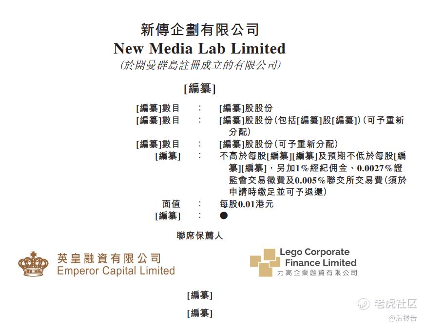 S&TLiveReport获悉,成立源于2022年新传企划有限公司New Media Lab Limited (以下简称“新传企划”)于2022年6月30日在港交所递交上市申请,拟香港主板上市。公司曾经在2021年6月15日及2021年12月15日递表,这是该公司第3次递交上市申请,联席保荐人为英皇融资及力高企业。