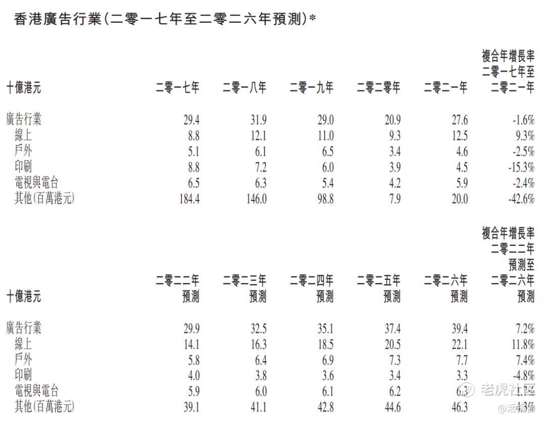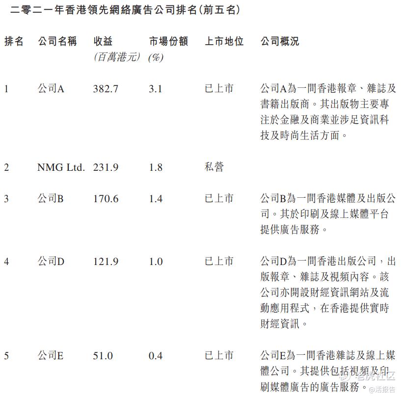 为配合公司的数码媒体平台发展,公司仍维持出版若干杂志及旅游指南(虽然与数码业务相比重要性不断减少),广告商亦可在该等杂志及旅游指南中投放广告。凭借在多个媒体平台上接触不同类别的读者,公司能提供综合广告解决方案及满足不同客户的广告需要以及将客户在公司的数码媒体平台产生的流量以及受众对公司的印刷刊物的兴趣变现为收益。就收益而言,公司于二零二零年及二零二一年位列香港网络广告代理公司第二位,市场份额分别约为1.9及1.8%。