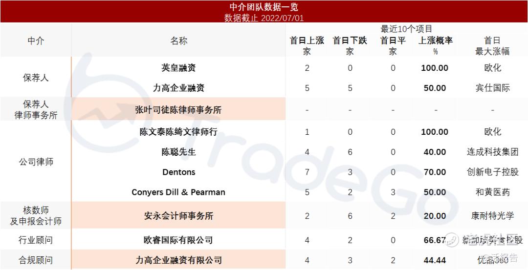 据捷利交易宝数据统计,新传企划中介团队共计10家,其中保荐人共计2家,近10家保荐项目数据表现较好;公司律师共计4家,综合项目数据尚可。整体而言中介团队历史数据表现尚可。
