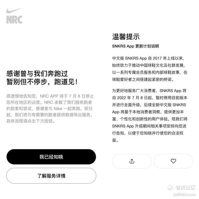 继爱彼迎、Kindle离开后,此前耐克宣布,将于7月8日停止NRC App在中国地区的运营,中文版SNKRS App也将暂时停用目前版本并进行全面升级。