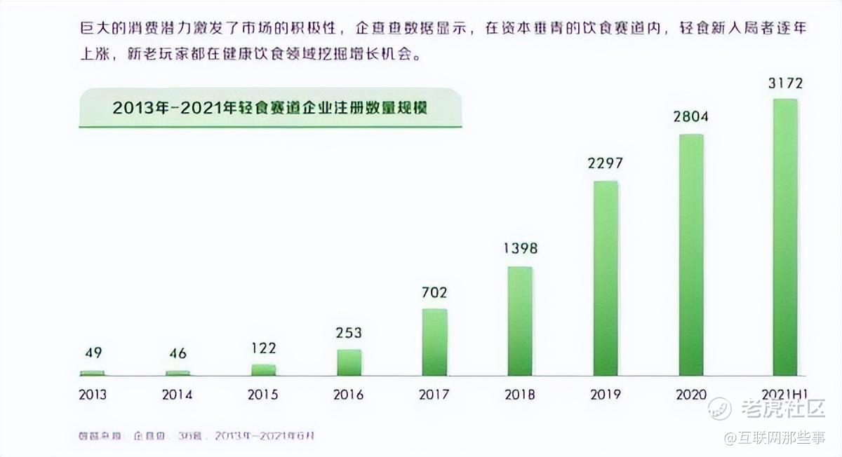 据天眼查数据显示,我国现存“轻食”相关企业超过1.3万家,2021年上半年新增相关企业超过3000家,同比增长75.87%,近十年来相关企业注册量整体呈增长趋势。