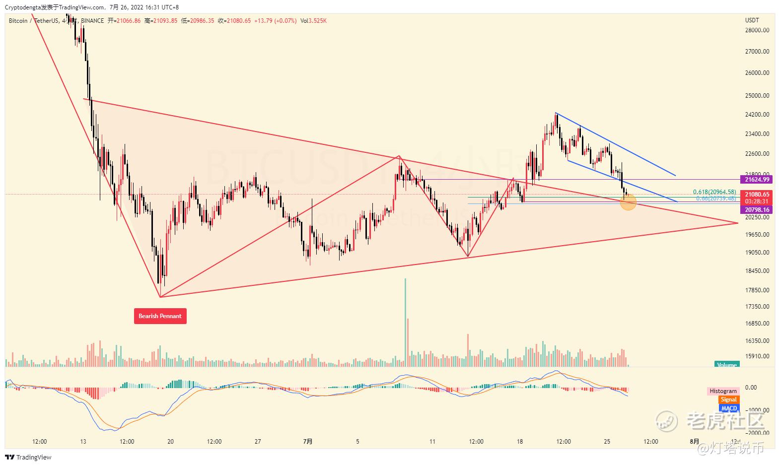 交易计划:止盈阶段性空单,短期关注这里的假跌破或者支撑反弹,上方关注反弹楔形阻力遇阻继续下跌21400-21600,上方关注22600的强弱分水岭,在这之下还可以反弹逢高空,在这之上,则回撤0.618位置支撑有效,继续看涨