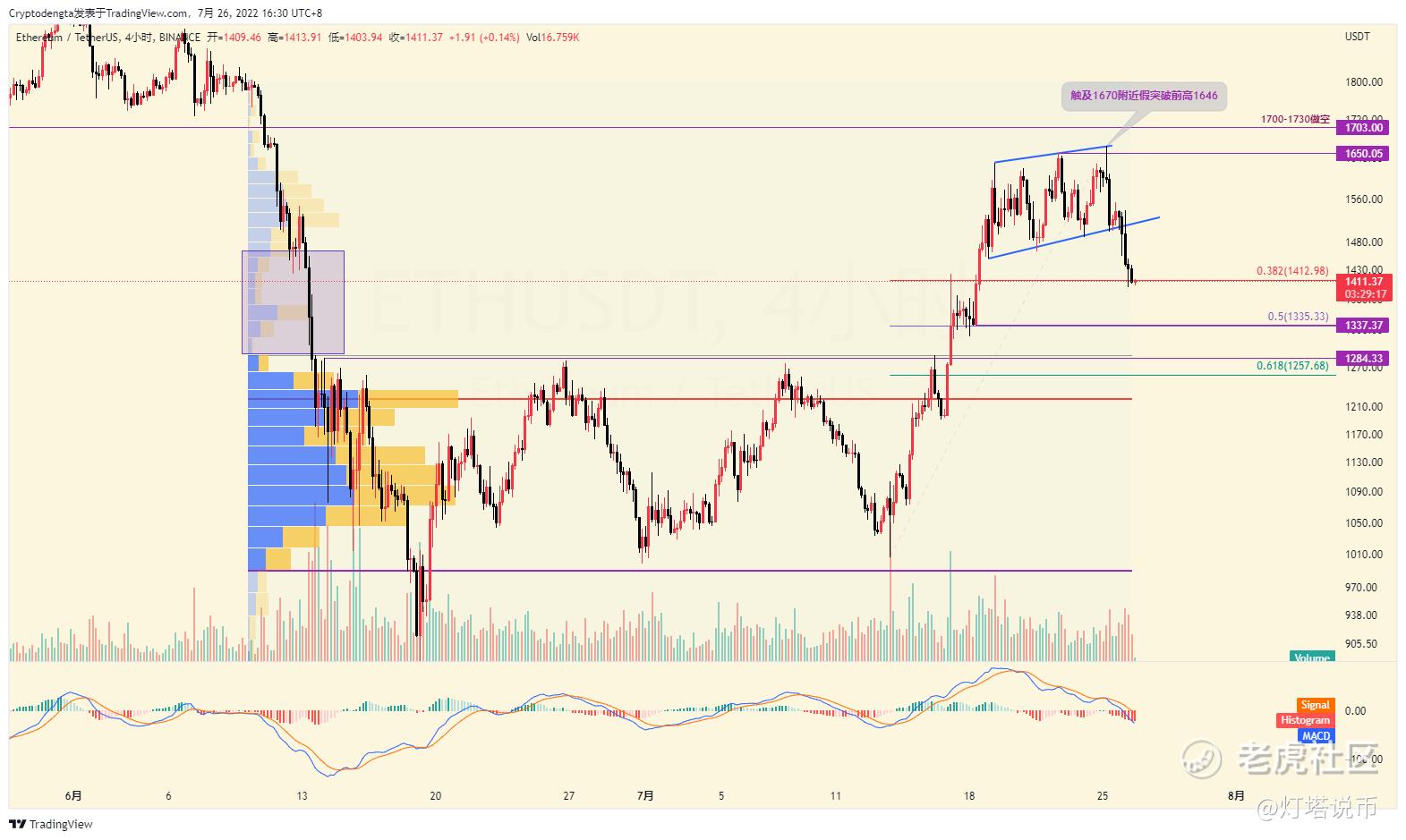4小时图所示,高位盘整的上升楔形跌破,就出现了加速,并且在跌破1460区间支撑后直接加速,这在昨天有提醒到,从密集成交区可以看到从1460到1340区间基本没有换手成交量形成支撑,意味着从高点下跌,这区间内会下跌非常快,今天短期止跌1400附近是因为这里是底部反弹回撤的0.382位置,这里支撑目前不够力度