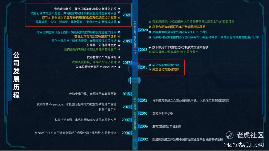 公司的发展历程给出了清晰的答案,2015年进入研究准备阶段,2021年成为开启智能化标志性的一年。也许诸君与笔者调研前一样,对四维图新的认识还停留在2015年车联网概念、腾讯系的传统图商,适逢2021年公司采用了全新的业务体系(智云、智驾、智芯、智舱),本文将逐一介绍。清晰之后,再去思考一个问题:面对智能化的历史机遇,四维图新能否华丽转身,完成蜕变?