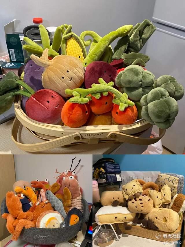 “最受欢迎的是龙虾和茄子,在其皮毛上划出图案就能做成各种表情包。他们两个有一种恰到好处的丧和贱,一度成为顶流,全面断货。”Jellycat重度爱好者饼饼称。
