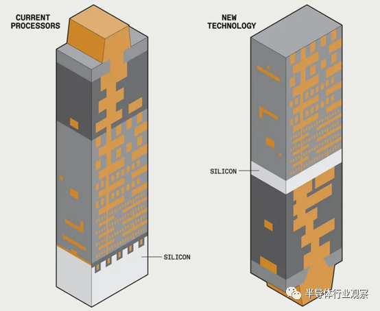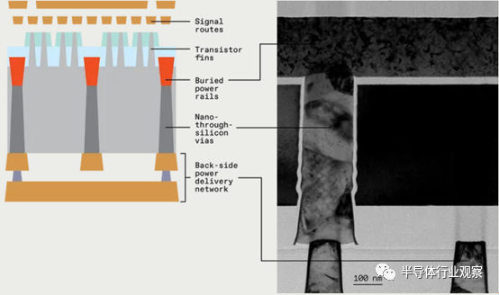 “背面供电”技术需要将晶体管下方的硅减薄至500nm或者更小,由垂直穿过硅背面的微米级通孔供电,将硅的背面连接到埋入电源轨的底部。