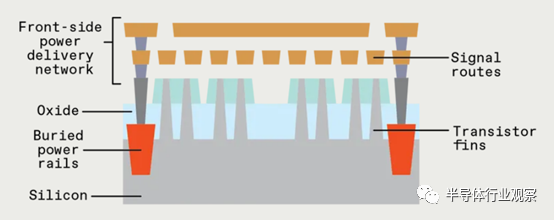 上文提到的“埋入式电源轨”技术,就是在此背景下应运而生。该技术原理是在晶体管下方而不是在晶体管上方建立电源连接,目的是创建更粗、电阻更低的轨道,并为晶体管层上方的信号承载互连腾出空间。