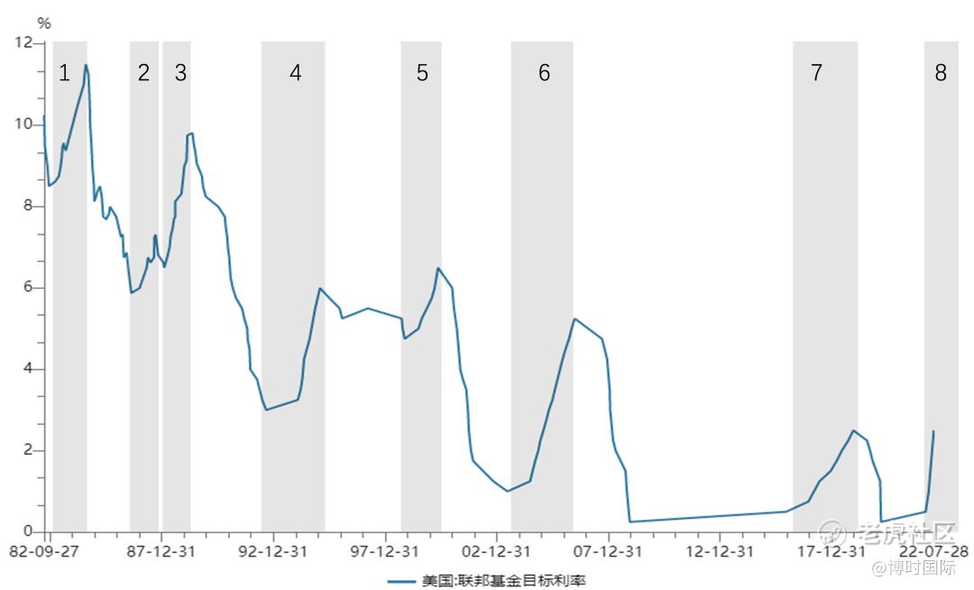 什么是加息周期?“加息”其实就是调高美国的联邦基金利率,联邦基金利率是美联储核心的货币政策工具。美联储加息实际是反映出美联储将货币政策由宽松变为紧缩。通常情况下,将美联储从宽松转向紧缩、连续加息开始,到最后一次加息为止定义为一轮加息周期。除了本轮已经开始的加息周期外,自上世纪80年代起,美联储共经历了7轮明显的加息周期。今年3月16日,美联储宣布将美国联邦基准利率上调25基点至0.25%-0.50%区间,正式启动了美国新一轮加息周期,结束了自2019年8月以来的减息周期。