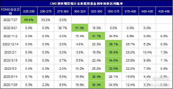 - 美联储在6月的FOMC会议,给出了2.5%的中性利率,可以认为是紧缩的目标。 但是中性利率目标不上调的情况下,鉴于高通胀,美联储依然需要继续紧缩几次,把基准利率提高到中性利率之上。如果后续通胀不超预期的话,美联储不需要再进一步提高加息速度。CME的利率期货预计9月加息50bp,明年中可能预计降息预期。
