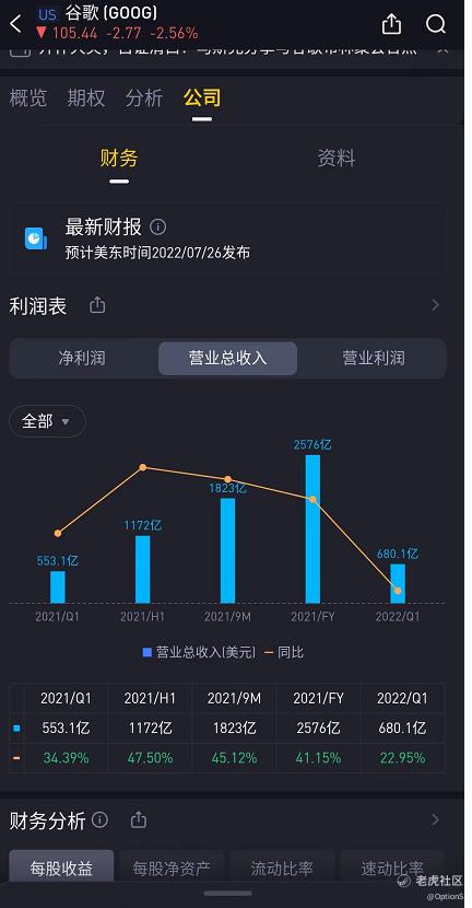 要熟练使用老虎来做基本面分析,我常看这个地方:个股页-公司-财务-利润表-营业总收入,如下图,可以看出,都移动互联网时代这么多年了,谷歌这么大的体量,依然能取得同比百分之小几十的增长,很难,也很牛。想起投资方经常鞭策创业者的一句话:如果你在创业,公司营收增长还比不上这些千亿美金,万亿美金估值的大公司,那还不如买这些公司股票算了。。