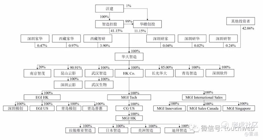 IPO前,汪建旗下智造控股持股41.15%,汪建旗下华瞻创投持股为11.15%;汪建间接持股为52.3%,为实控人。汪建还是华大基因董事长。