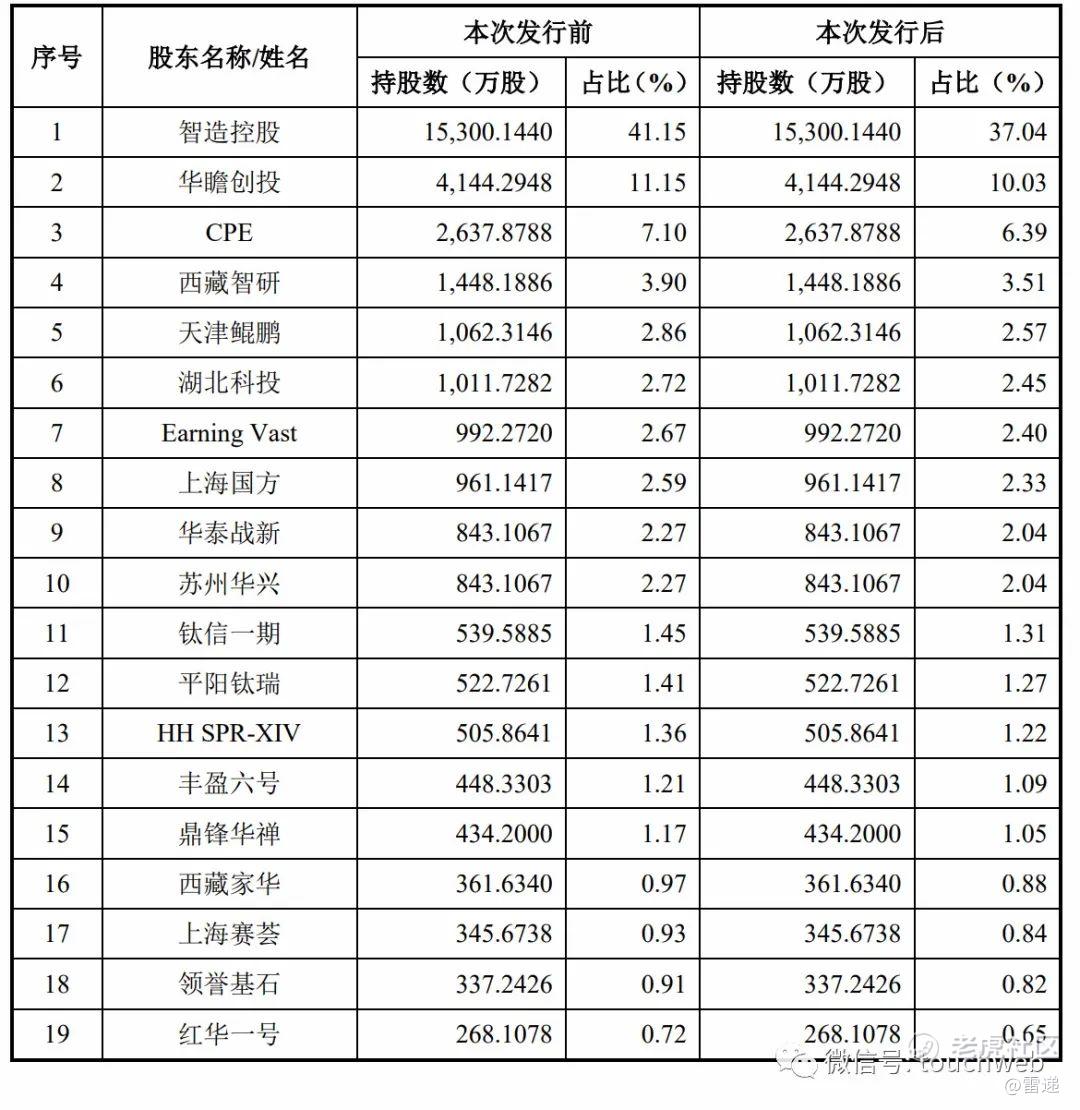 此外,CPE持股7.1%,天津鲲鹏持股为2.86%,湖北科投持股为2.72%,上海国方持股为2.59%,华泰战新持股为2.27%,苏州华兴持股为2.27%。