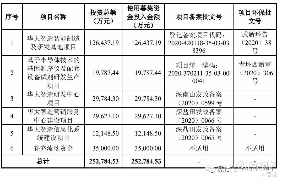 此次募资中12.6亿元用于华大智造智能制造及研发基地项目,1.98亿元用于基于半导体技术的基因测序仪及配套设备试剂研发生产项目、近3亿元用于华大智造研发中心项目、近3亿元用于华大智造营销服务中心建设项目。