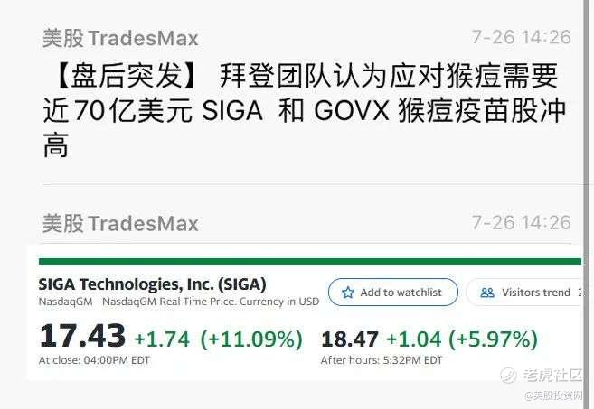 相关猴痘概念股集体暴涨, $SIGA Technologies Inc(SIGA)$ +7%,$GeoVax Labs Inc(GOVX)$ +35% $Chimerix Inc.(CMRX)$ +8%,盘中我们第一时间提示Vip社区,入手了 SIGA, 当时股价16.5美元,收盘前大涨11%