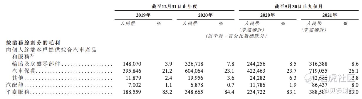 就服务类型来看,途虎养车的收入主要来自于提供综合汽车产品和服务,其中轮胎和底盘零部件的收入的贡献最高。2019年、2020年以及2021年前三季度,轮胎和底盘零部件的收入分别为38.39亿元、42.02亿元、36.78亿元,占比分别54.6%、48%、43.6%。