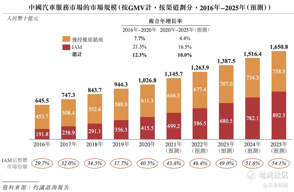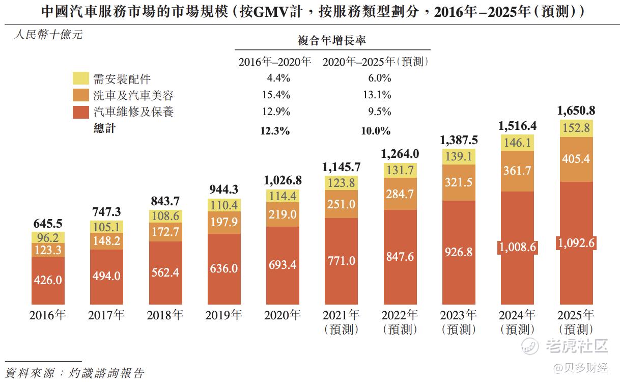 与之对应的是,这一市场前景十分广阔。根据灼识咨询报告,2020年,中国汽车服务市场(包含汽车维修及保养、洗车及汽车美容以及需安装配件)规模已达人民币1万亿元,预计将以10.0%的复合年增长率在2025年达到人民币1.7万亿元。